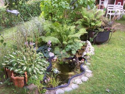 Precis till höger när man kommer upp för trappan så kommer man till min lilla damm. Den är inte så fin just nu... hade tänkt ta bort plastdammen och göra en med duk. Det får bli till nästa sommar då jag aldrig kom igång i år... (eller något år...)